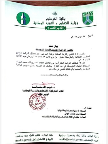 تعطيل الدراسة بالمدارس الابتدائية والمتوسطة بالخرطوم بسبب اجراء امتحانات الشهادة المتوسطة