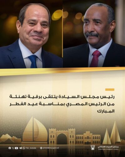 رئيس مجلس السيادة يتلقى برقية تهنئة من الرئيس المصري بمناسبة عيد الفطر المبارك .
