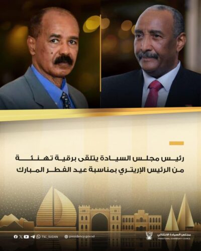 رئيس مجلس السيادة يتلقى برقية تهنئة من الرئيس الإريتري بمناسبة عيد الفطر المبارك .