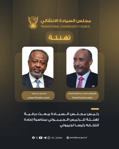 رئيس مجلس السيادة يبعث برقية تهنئة للرئيس الجيبوتى بمناسبة إعادة انتخابه رئيسا لجيبوتى