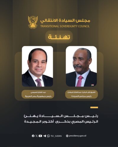 بعث رئيس مجلس السيادة ،، القائد العام للقوات المسلحة الفريق أول الركن عبدالفتاح البرهان، ببرقية تهنئة إلى الرئيس المصرى عبد الفتاح ، بمناسبة ذكرى أكتوبر المجيدة، متمنياً للقيادة وجمهورية مصر العربية وشعبها كل التقدم والازدهار وعبر رئيس المجلس السيادي عن تقديره العميق لمستوى التطور الذي تشهده العلاقات الثنائية المتميزة، في كافة المجالات، وأكد الفريق اول البرهان عزمه على مواصلة العمل سوياً من أجل تعزيز علاقات التعاون المتميزة القائمة بين البلدين والارتقاء بها بما يحقق المصالح المشتركة