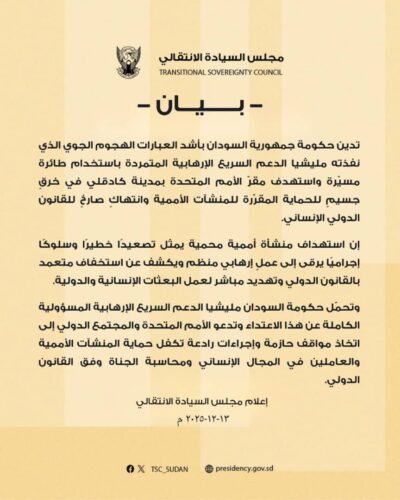 ادانت الحكومة بأشد العبارات الهجوم الجوي الذي نفذته مليشيا الدعم السريع الإرهابية باستخدام طائرة مسيّرة مستهدفة مقرّ الأمم المتحدة بمدينة كادقلي في خرقٍ جسيمٍ للحماية المقرّرة للمنشآت الأممية وانتهاكٍ صارخٍ للقانون الدولي الإنساني. وقالت فى بيان إن استهداف منشأة أممية محمية يمثل تصعيدًا خطيرًا وسلوكًا إجراميًا يرقى إلى عملٍ إرهابي منظم ويكشف عن استخفاف متعمد بالقانون الدولي وتهديد مباشر لعمل البعثات الإنسانية والدولية. وحملت الحكومة مليشيا الدعم السريع الإرهابية المسؤولية الكاملة عن هذا الاعتداء ودعت الأمم المتحدة والمجتمع الدولي إلى اتخاذ مواقف حازمة وإجراءات رادعة تكفل حماية المنشآت الأممية والعاملين في المجال الإنساني ومحاسبة الجناة وفق القانون الدولي.