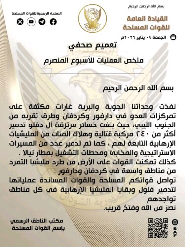 أعلنت القوات المسلحة في تعميم صحفي إن الوحدات الجوية والبرية نفذت غاراتٍ مكثفةٍ على تمركزات الملييشيا الارهابيه في “دارفور وكردفان وطرق بالقرب من الجنوبِ الليبي، حيث بلغت خسائر مرتزقة آل دقلو تدمير أكثر من 240 مركبةٍ قتاليةٍ وهلاك المئات من المليشياتِ الإرهابيةِ التابعة لهم”. واضافت “كما تم تدمير عدد من المسيراتِ الاستراتيجية والمخابئ ومحطات التشغيل بمطار نيالا ، كذلك تمكنت القواتُ على الأرض من طردِ مليشيا التمرد من مناطق واسعة في كردفان ودارفور”. واكد التعميم الصحفي ان القوات المسسلحة والقوات المساندة مستمرة فى عملياتها لتدميرِ فلول وبقايا المليشيا الإرهابية في كلِ مناطق تواجدهم