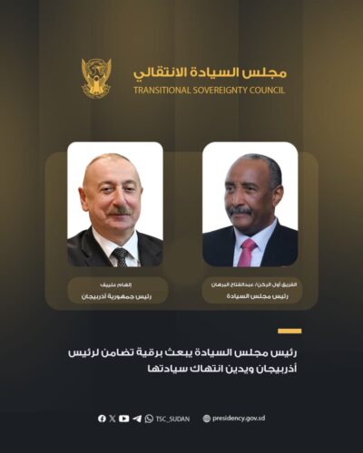 بعث السيد رئيس مجلس السيادة الانتقالي، الفريق أول الركن عبد الفتاح البرهان، برقية مواساة وتضامن إلى فخامة الرئيس إلهام علييف، رئيس جمهورية أذربيجان، إثر التطورات الأخيرة التي شهدتها بلاده.
