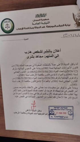 أصدرت نيابة الجرائم الموجهة ضد الدولة ومكافحة الإرهاب إعلاناً بالنشر في مواجهة المتهم الهارب مجاهد بشرى، وذلك على ذمة دعاوى جنائية تتعلق بجرائم تمس أمن الدولة وقضايا الإرهاب.وأوضح وكيل النيابة الأعلى، في الإعلان، أنه وبموجب السلطات المخولة له وفق المادة (78) من قانون الإجراءات الجنائية لسنة 1991م، وبناءً على الدعوى الجنائية بالرقم (2026/12م) فقد تم إصدار أمر قبض في مواجهة المتهم.وأشار إلى أن المعلومات المتوفرة ترجّح قيام المتهم بالهروب أو التخفي بغرض تفادي تنفيذ أمر القبض، داعياً المتهم إلى تسليم نفسه لأقرب قسم شرطة خلال فترة لا تتجاوز أسبوعاً من تاريخ نشر الإعلان. كما ناشدت النيابة العامة المواطنين التعاون مع السلطات المختصة والمساعدة في القبض على المتهم.